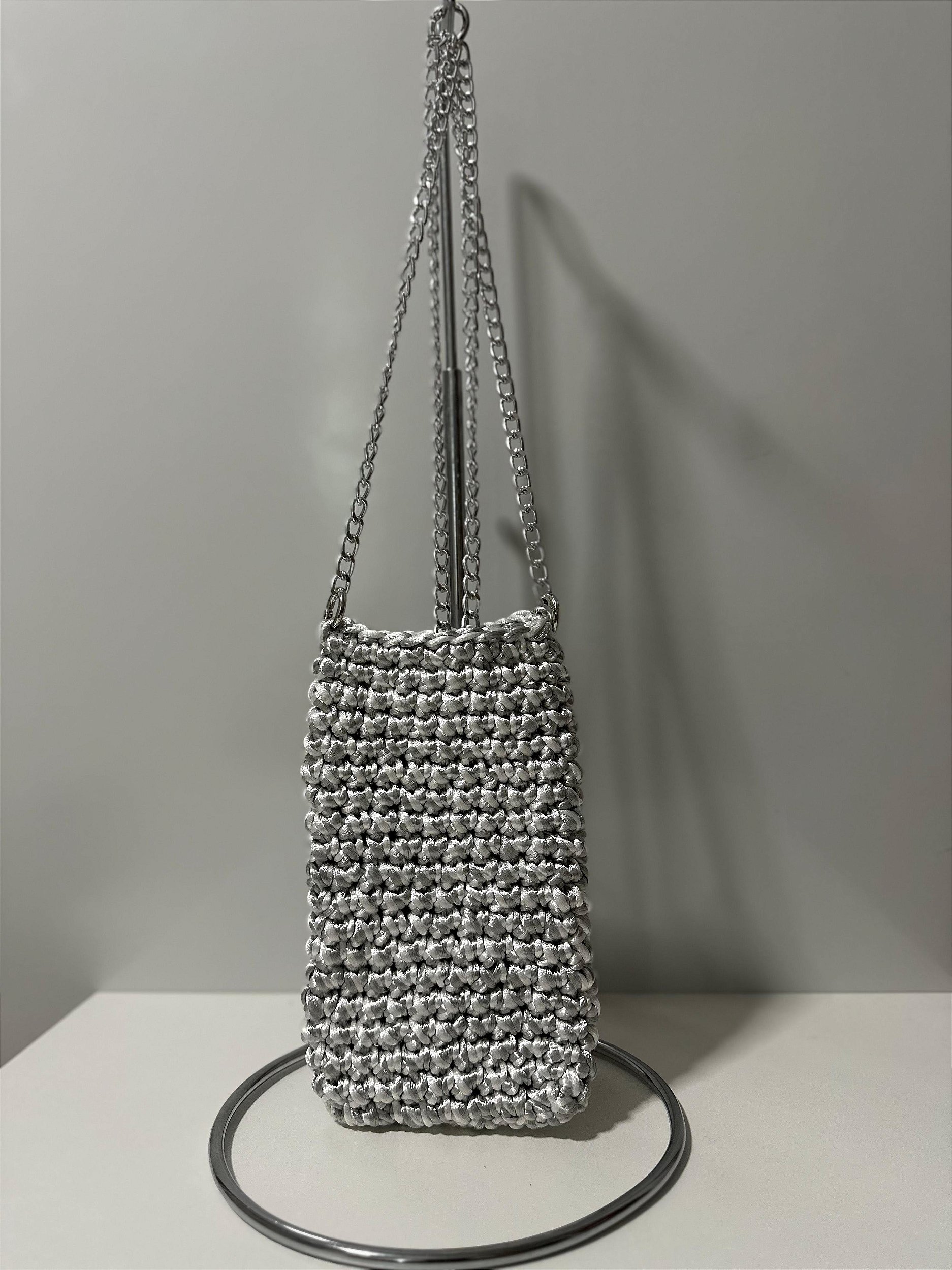 Bolsa estilo porta-celular confeccionado em crochê, com fio acetinado.
